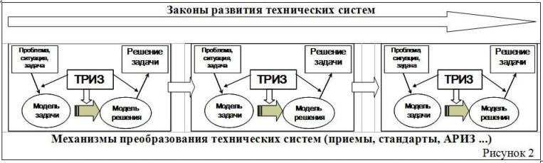 За каждый шаг (звено в цепочке) такого изменения в ТРИЗ отвечают механизмы разрешения противоречий: приемы, стандарты, АРИЗ, эффекты и пр. Последовательность шагов развития происходит во времени и таким образом выстраивается цепочка, развернутая во времени. Эта последовательность, цепочка развития описывается законами развития. Необходимо четко отличать законы развития ТС от инструментов преобразования ТС. Законы связаны с филогенезом, а инструменты преобразования ТС – с онтогенезом.