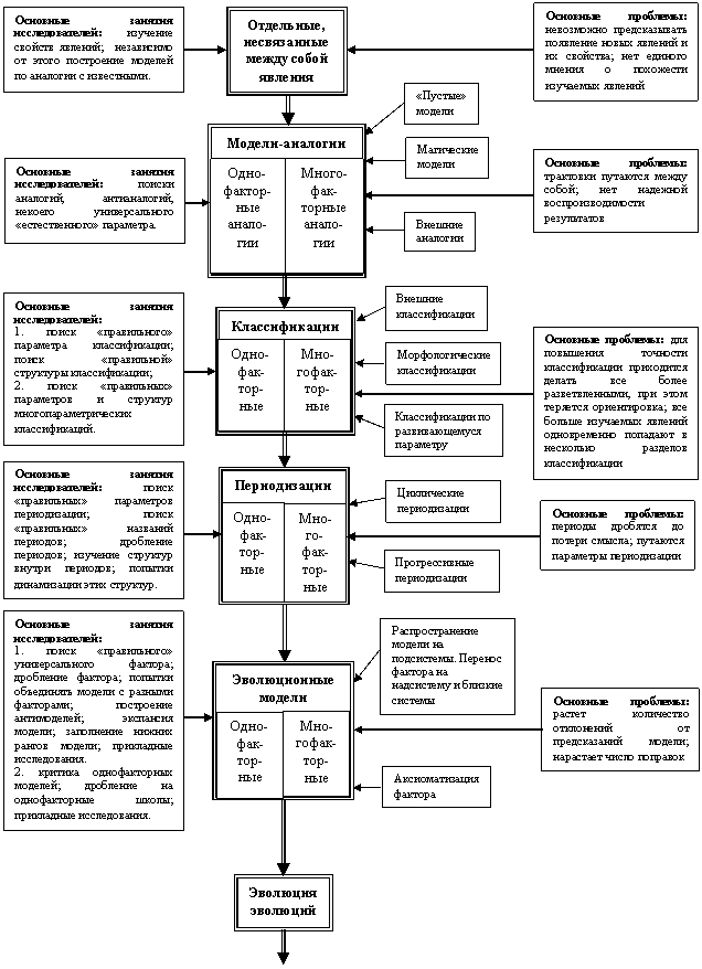 Первая закономерность проявилась из простого хронологического расположения моделей. Научные представления о мире и его явлениях проходят определенные стадии. Стадии обычно следуют одна за другой в определенном порядке. Каждая стадия имеет свои структуру и свойства (см. схему). Вот краткое описание этих стадий.